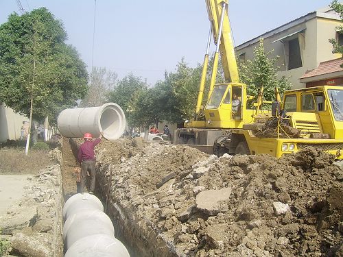 (水业中国网上海工作站10月21日讯)10月20日,山东省枣庄市滕州洪绪镇二污支管网工程施工人员正在紧张吊装污水管道。该工程是洪绪镇根据淮河流域水污染防治目标要求开工建设的2008年环保重点工程,总投资700万元,铺设管道6.5公里,建设污水提升泵站1座,计划10月底建成使用。工程全面竣工后,洪绪镇境内工企业及居民生活废水将可全部进入滕州市第二污水处理厂处理,实现污水“零排放”。