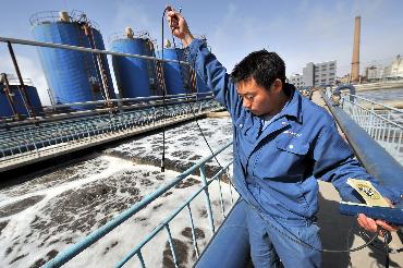 (水业中国网上海工作站04月13日讯)4月13日,宁夏永宁县一名工人在污水处理池旁检测水质。