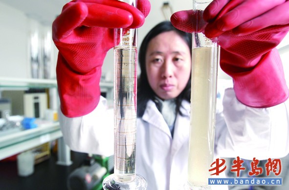 2月14日上午,记者来到李村河处理厂,见到了正在检测水的李村河污水处理厂总工程师刘浩和办公室的刘贤联。“我们处理的污水上周刚通过市环保局的验收 ,目前出水水质已经优于一级A的标准。”刘浩说着带记者到了污水处理厂处理车间,工作人员从污水处理后的池中提取样本,污水和处理后的水放在一起对比,浑浊的污水经过处理后,肉眼看去已经比较清澈,跟普通的自来水差不多,只有一点淡淡的微黄。