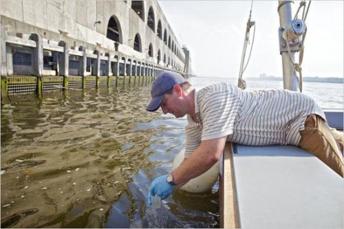图为:上周,发生故障的北河污水处理厂附近,纽约皇后学院环境微生物学助理教授格雷戈里·奥穆兰正在提取哈德逊河水样。