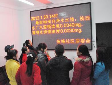 为了帮助居民了解事件真相、消除疑虑,社区工作人员在给居民宣讲的同时,于1月30日将这几天《柳州日报》刊登的我市应对龙江水镉超标污染环境突发事件的报道,和市处置龙江突发环境事件应急指挥部发的“只要水龙头拧开出的水,必定是合标的安全用水,请大家放心使用;在控制供水之前24小时,将通过新闻媒体提醒您贮存好备用水”的温馨提示打印出来,一并张贴到社区告示栏和居民楼。许多居民看后表示,党报说自来水是安全卫生的,我们就放心用了。