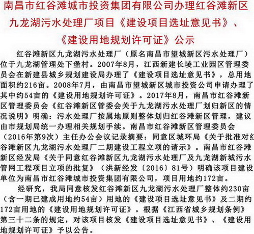 经研究,南昌市城乡规划局同意核发红谷滩新区九龙湖污水处理厂整体约230亩(含一期已建成用地约54亩)用地的《建设项目选址意见书》及二期约172亩用地的《建设用地规划许可证》。