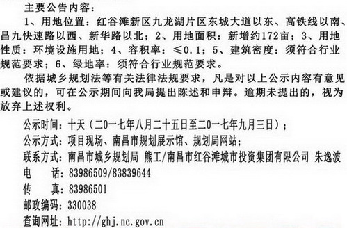 (水业中国网上海工作站8月29日讯)2017年8月28日,南昌市城乡规划局对外公示红谷滩新区九龙湖污水处理厂项目。记者了解到,红谷滩新区九龙湖污水处理厂项目为红谷滩新区九龙湖片区东城大道以东、高铁线以南、昌九快速路以西、新华路以北,用地面积新增约172亩。