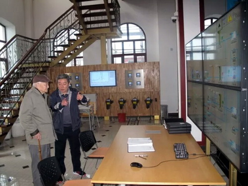 图为:2015年陈吉余院士(左)在城市水资源开发利用(南方)国家工程研究中心顾玉亮总经理陪同下参观青草沙水源给水装备验证基地。