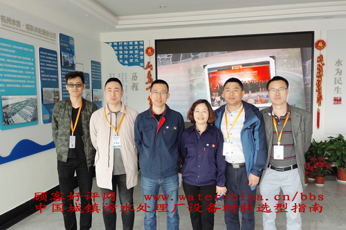 图为:浙江省杭州市七格污水处理厂三期工程党支部书记黄伟和郭红峰厂长与无锡排水总公司的参会代表一起合影。