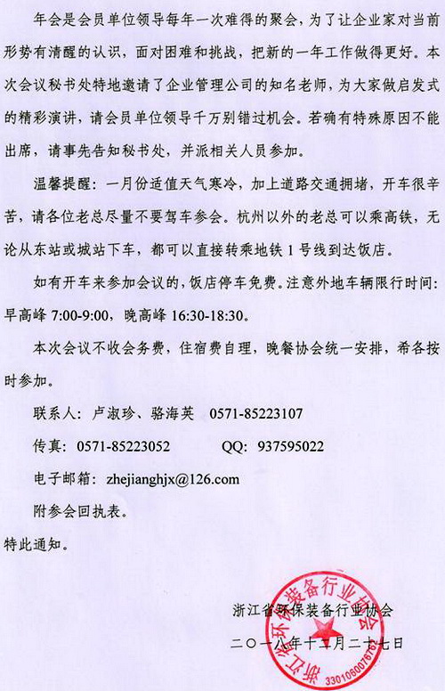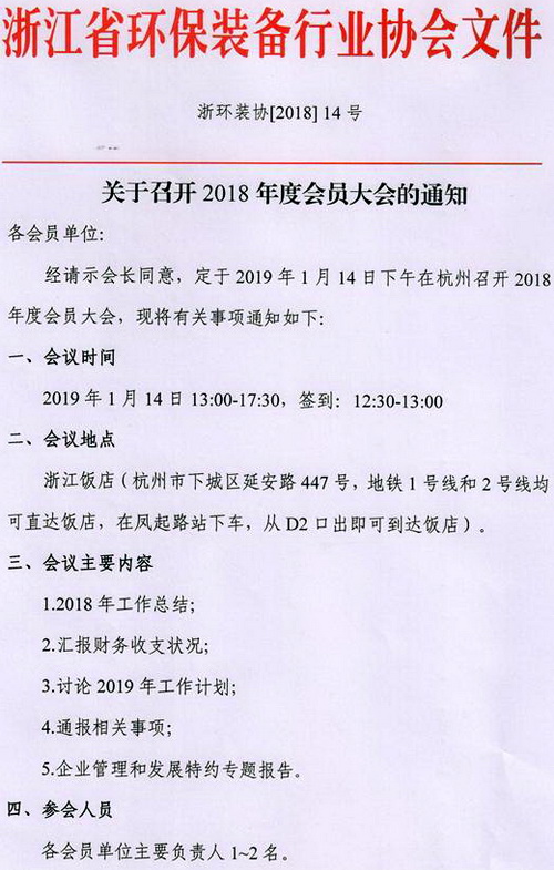 浙江省环保装备行业协会2018年度会员大会即将召开(图)