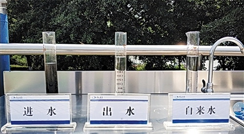 图为:重庆市鸡冠石污水处理厂的污水、出水、自来水的对比照片。