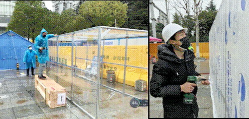 2020年3月2日,中建环能快速研发的防疫新产品“速净舱”消毒通道抵达武汉,用于洪山区一方舱医院的人员进出消毒。“速净舱”这个消毒通道产品适用于人流量大的公共场所,采用84消毒液雾化通道密封式消杀,可有效阻断人员衣物病毒携带的传播风险。而方舱医院正是疫情高危风险场所,为了快速完成任务,黄鹏和他的伙伴没有犹豫和退缩,勇毅前行。