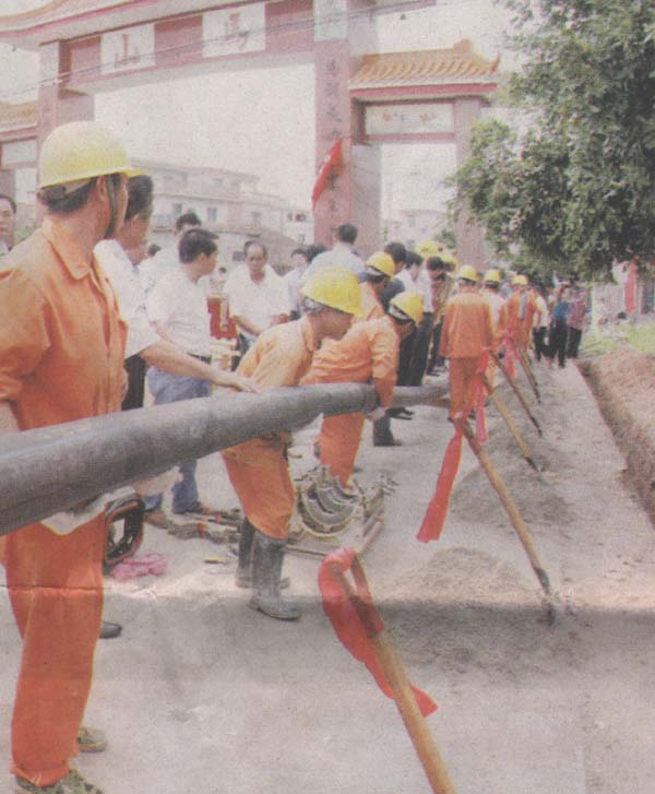 (水业中国网上海站8月29日讯) 17日上午,斗门乾务镇马山村村口锣鼓喧天,雄狮起舞。在村民们的欢呼和掌声中,工人们一起把第一根水管放进挖好的地下水管道里(记者 雁行 摄),市、区水务局和镇村领导们握着铁锹开始往里填土。这一刻标志着马山村自来水改造工程正式动工,居民们即将结束世世代代吃水难、吃好水更难的日子。