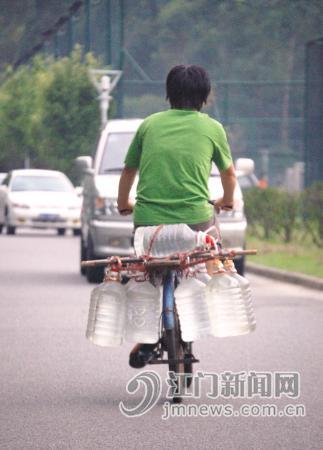 图为:用自行车搭上11瓶山泉水,这位市民满载而归。