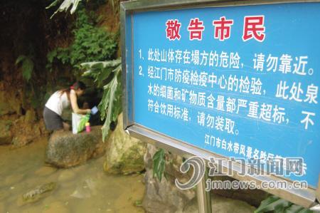 记者在此泉眼旁边发现,白水带风景名胜区管理处在此竖起了“敬告市民”的牌子,上面写着:1、此处山体存在塌方的危险,请勿靠近。2、经江门市防疫检验中心的检验,此处泉水的细菌和矿物质含量都严重超标,不符合饮用标准,请勿装取。